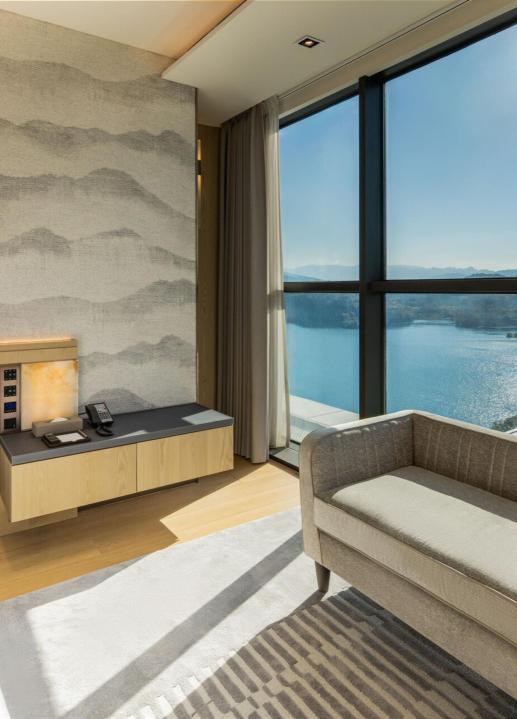 皇家套房以近百坪的寬闊空間,完美融合壯麗的湖畔景觀與奢華設計,展現極致品味的度假格局。從典雅的客廳、舒適的臥室到專屬露台,每一處細節皆以自然與美學交織的巧思,成就獨一無二的湖景饗宴。