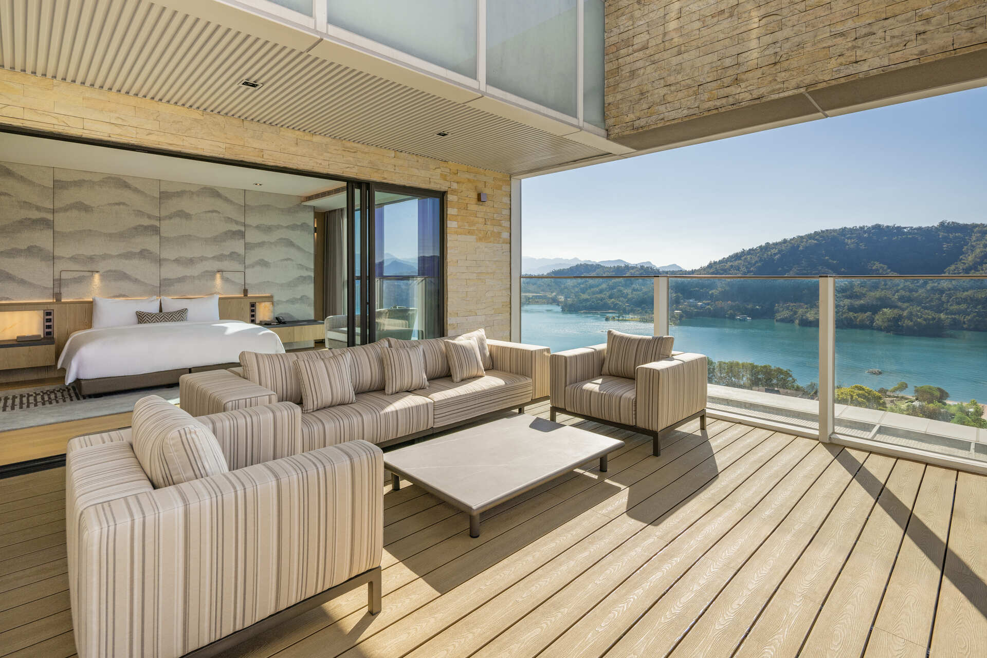 皇家套房以近百坪的寬闊空間,完美融合壯麗的湖畔景觀與奢華設計,展現極致品味的度假格局。從典雅的客廳、舒適的臥室到專屬露台,每一處細節皆以自然與美學交織的巧思,成就獨一無二的湖景饗宴。